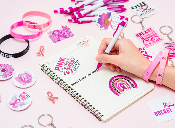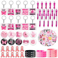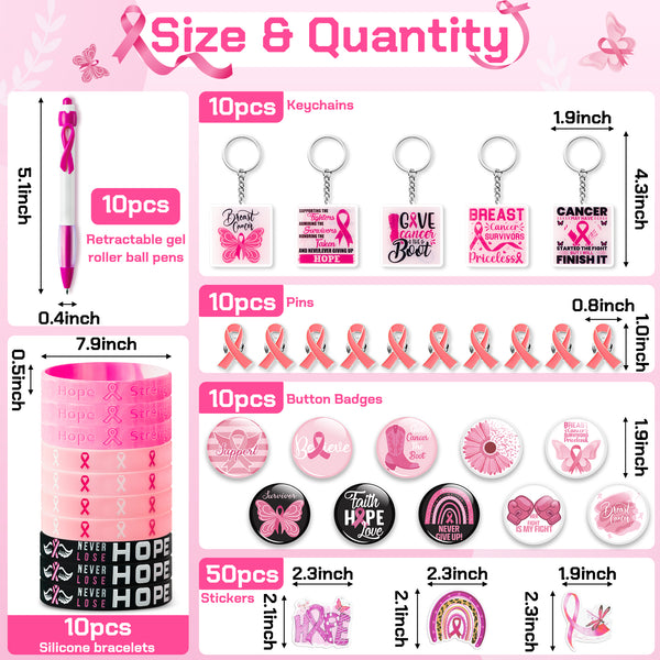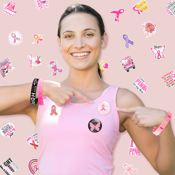 [Breast Cancer Awareness Theme Set] You will get 50pcs breast cancer stickers, 10pcs breast cancer keychains, 10pcs breast cancer button badges, 10pcs retractable gel rollerball black pens, 10pcs breast cancer silicone bracelets and 10pcs pink ribbon badges, a total of 100pcs, enough to meet your various needs.