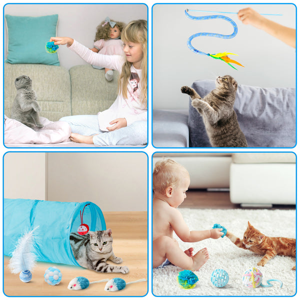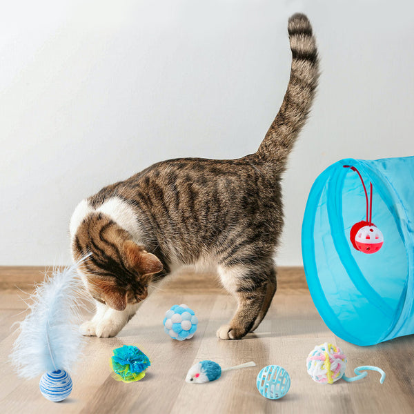 [You Can Get] There are 11Pcs cat toys to meet the different needs of cats, including foldable blue tunnel, blue mice, bell balls, cat springs, crinkle balls, etc, which are pet toys specially made for indoor cats.
