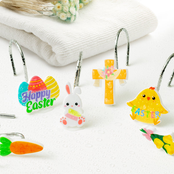 [Easter Shower Curtain Hooks] You will get 12 different patterns of Easter shower curtain hooks, such as bunnies, Easter eggs, chicks, carrots, crosses and flowers, etc., vivid and interesting shapes to add Easter atmosphere to your bathroom.