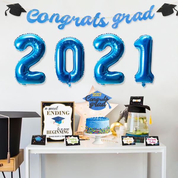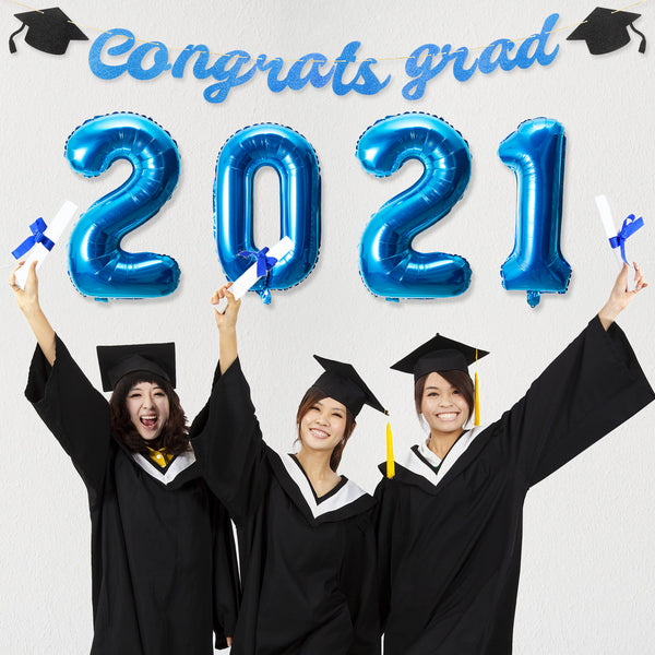 [Set Includes] 1Pcs blue graduation banner + 1Pcs cake topper + 4Pcs blue figure aluminum foil balloons + 9Pcs candy bar cards.