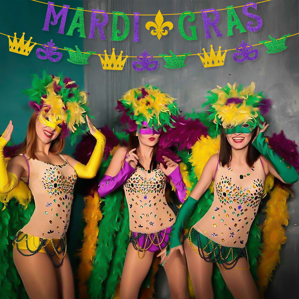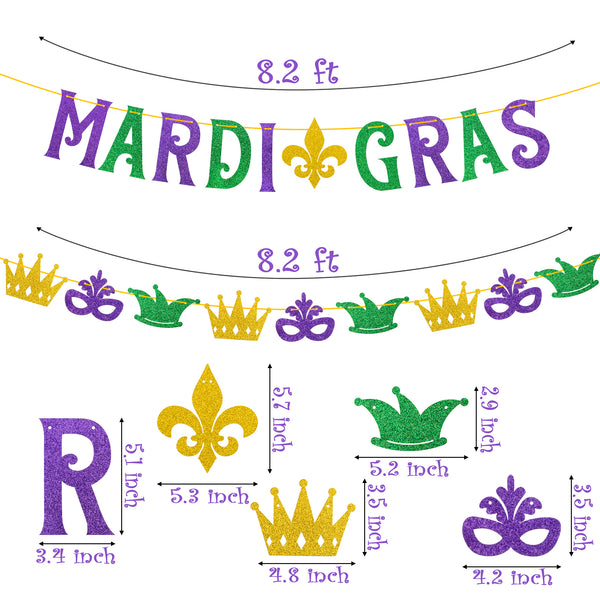 MALLMALL6 Mardi Gras Banner set is perfectly suitable for Mardi Gras, Fat Tuesday, Shrove Tuesday, New Orleans, carnival, costume party, etc. You can hang it at the party entrance, branches and ceilings, or on the background wall, hanging up dessert tables, backdrops, and other party space.
