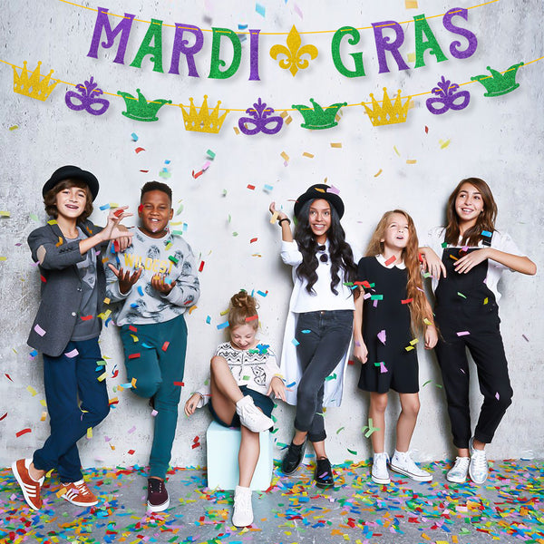 • [Design for MARDI GRAS] Our " It's MARDI GRAS Y'all " is passionate and vibrant. It seems like the party host shouting these slogans by your side. Green, purple, golden are the most representative colors of Mardi Gras. Our banner uses these 3 colors glittery paperboard which add an extra party atmosphere.