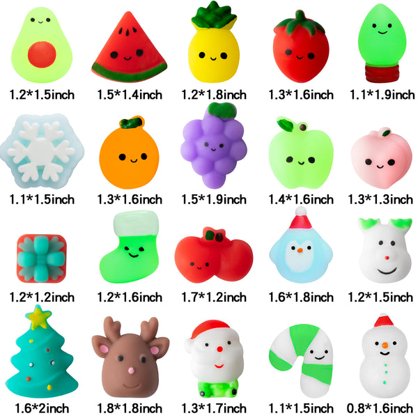 [VALUE PACK] Package includes 20Pcs Christmas-themed Mochi Squeeze Toys and 10pcs Fruit Mochi Squeeze Toys with various of styles, such as apple, grape, watermelon, pineapple, strawberry and so on. Kids will enjoy their Happy Christmas Party with this unique Christmas toys set.
