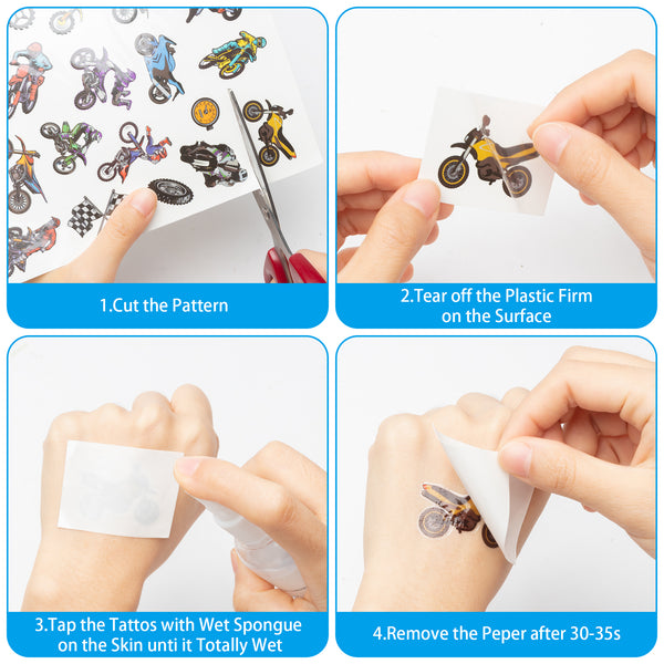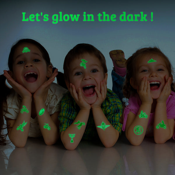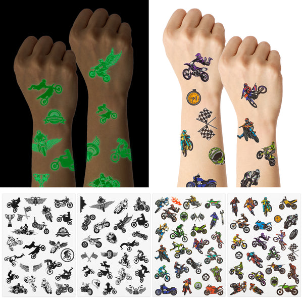 Luminous Dirt Bike Tattoos - 8pcs temporary luminous dirt bike tattoos are included, 4 styles in total. Our luminous dirt bike tattoos are designed with race motorbike elements and need to absorb sufficient light source in sunlight, then it will glow in the darkness.