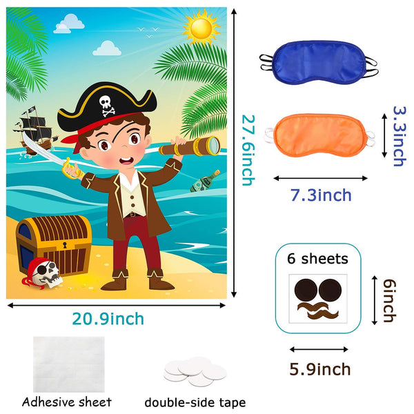 [You Can Get] 1 Sheet 20.9*27.6 inch pirate themed poster, 2pcs Blindfolds, 6 sheet removable stickers ( total 12pcs pirate eye patch stickers, 12pcs mustache stickers), 1s adhesive sheet, 6pcs double side round tape, beautiful color printed, good quality, can be reusable,easy to remove and no worry about leaving stains on wall.