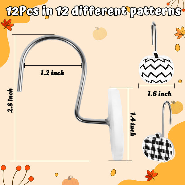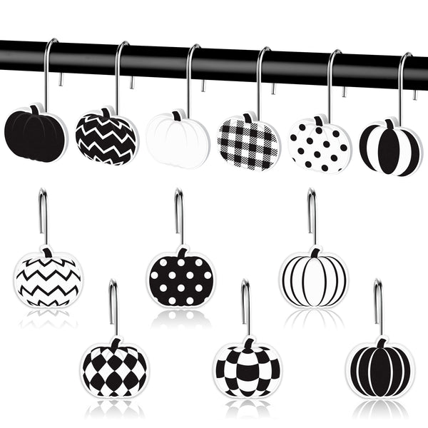 [Pumpkin Shower Curtain Hooks] You will receive 12 different styles of pumpkin shower curtain hooks, featuring a minimalist and fashionable black and white colour complemented by classic retro patterns such as waves, grids, diamonds, polka dots, stripes and so on. These designs seamlessly blend into the warm and cosy atmosphere of autumn, the warmth of Thanksgiving, and the mystery of Halloween, adding a festive touch to your home decor!