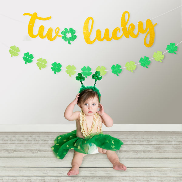 Not only does the sign mean too lucky, but also a very interesting design to use clover instead of the "O" of Two. With representative shamrock garland, golden glittery Two Lucky sign ideally matches your party's theme to celebrate your little angel's birth on the lucky day.